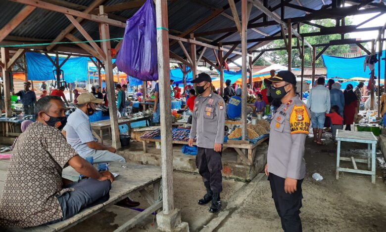 Pantau Situasi Pasar Tradisional, Kapolsek Bola Polres Wajo Sampaikan Himbauan Protokol Kesehatan Covid-19